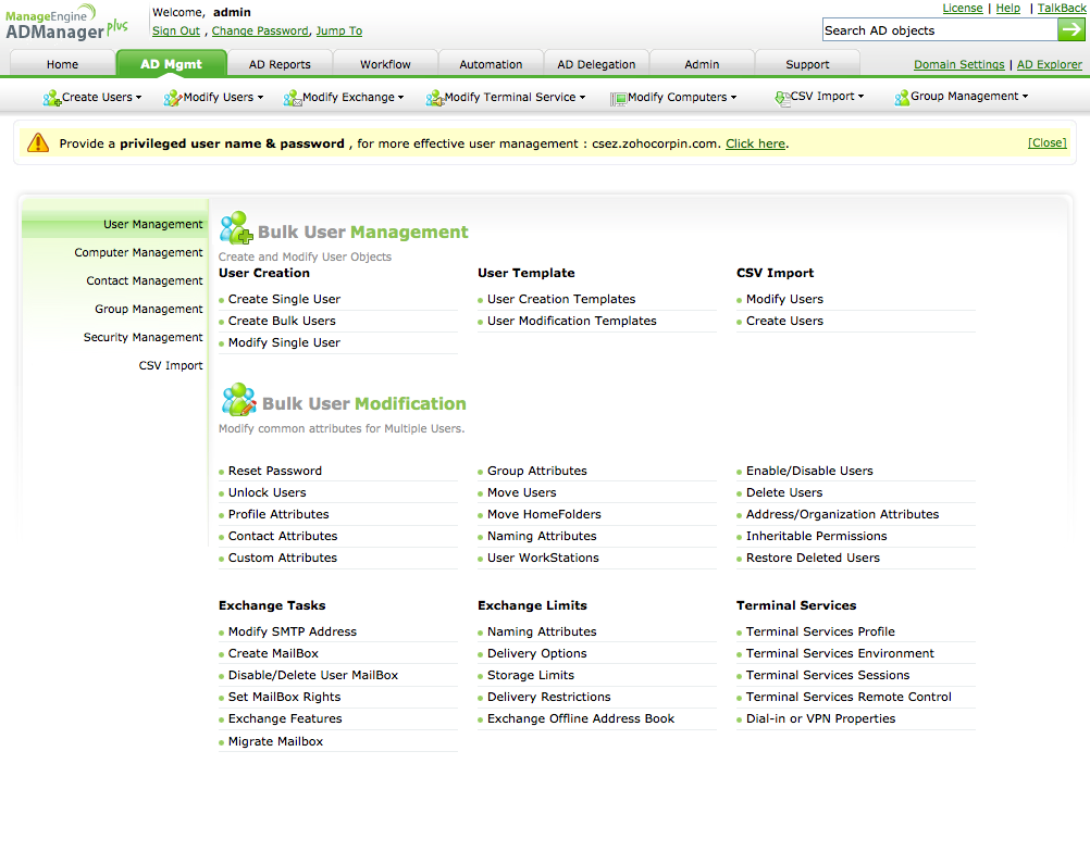 We used the ADManager Plus tool to manage Active Directory domains. In a simple and convenient way we created five roles for delegating powers to 49 professionals overseeing 18 units, to make it easier and faster.