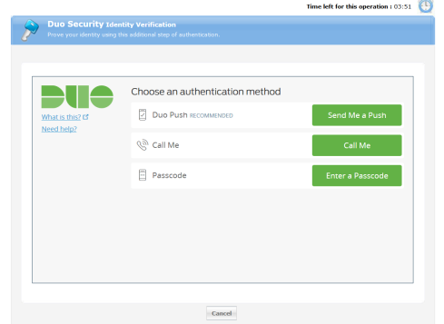 启用身份验证进程后,用户必须向Duo Security登记以进行多因素身份验证。他们可根据需要选择用于验证身份的通信方式。然后,他们将能够重置密码或解锁帐户。
