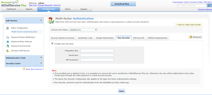 ADSelfService Plus中的多因素身份验证支持Duo Security,Duo Security是一个受到广泛信任的访问平台,它通过验证用户身份来保护机构。作为管理员,您可在不到 1 分钟的时间内为域中的用户配置Duo Security。