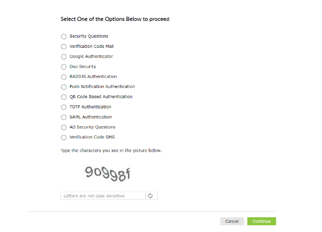 - 单击此链接将打开密码重置门户。用户需要通过任何强制身份验证方法来证明其身份,如基于短信的一次性密码(OTP)、基于电子邮件的OTP、谷歌身份验证器、DUO Securtiy和RSA SecurID。