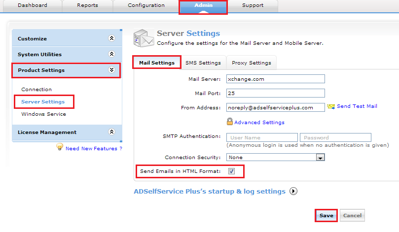 ADSelfService Plus sends email notifications such as Password Expiry Notification, Enrollment Reminders, etc., in plain text format. You can configure ADSelfService Plus to send email notifications in html format.