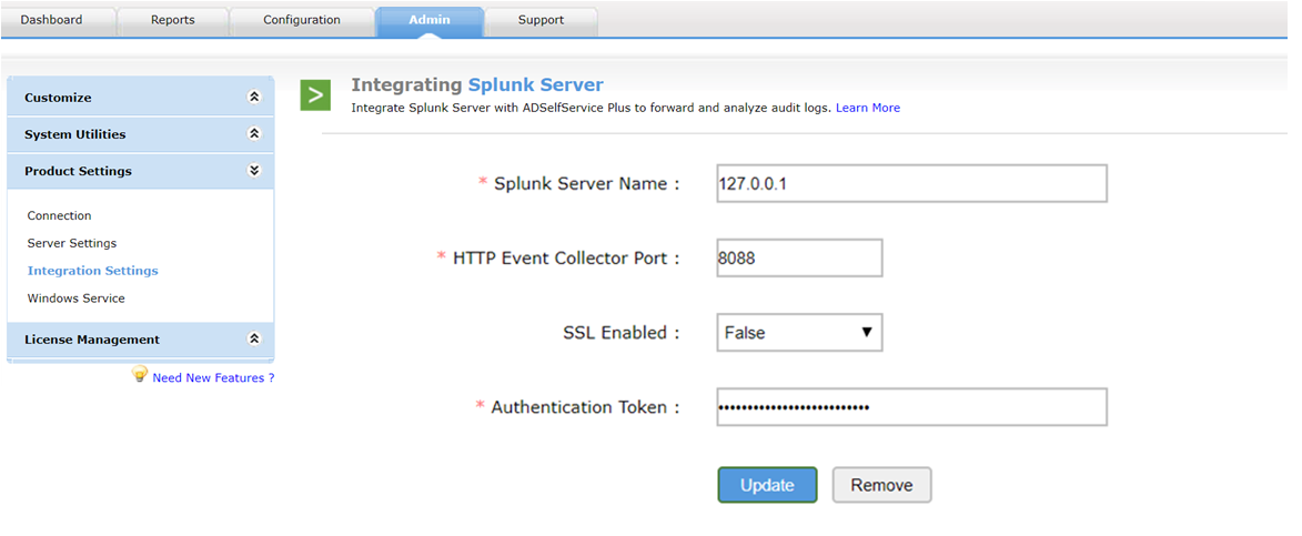 - • 输入Splunk 服务器名称、HTTP 事件收集器端口号和端口协议在内的详细信息,然后在Splunk中指定针对ADSelfService Plus生成的HTTP事件收集器令牌。