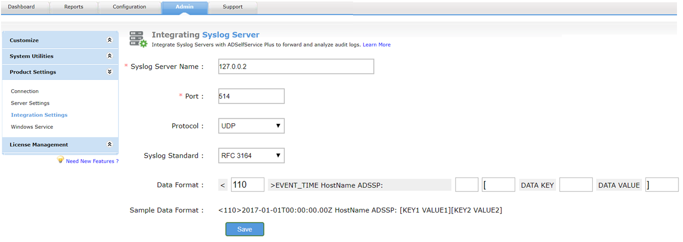 ADSelfService Plus可以与支持syslog格式的syslog服务器和SIEM(安全信息和事件管理)解决方案(如Splunk和EventLog Analyzer)集成,以便您可以实时转发审计日志并获取有关用户活动的宝贵洞察。