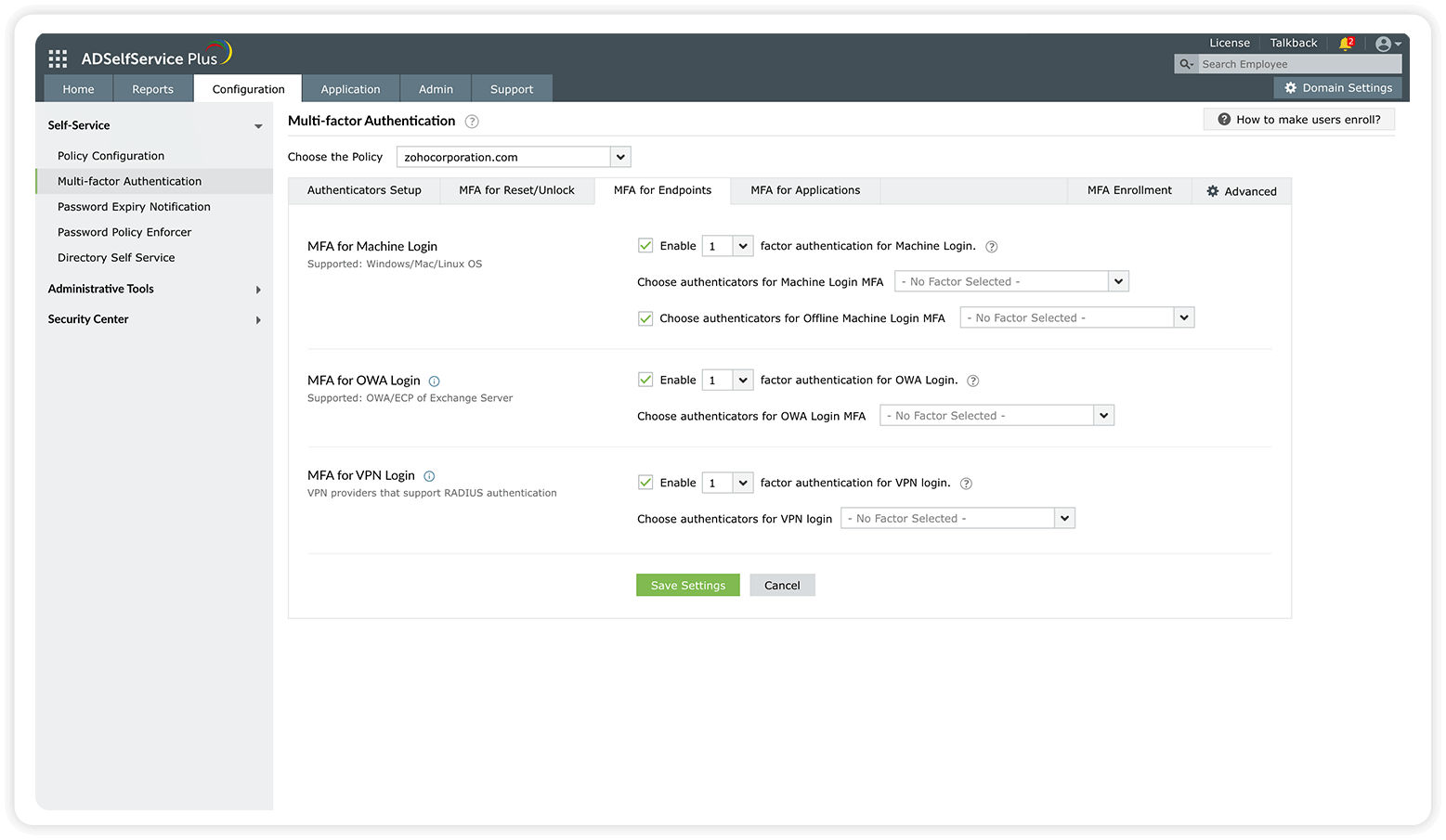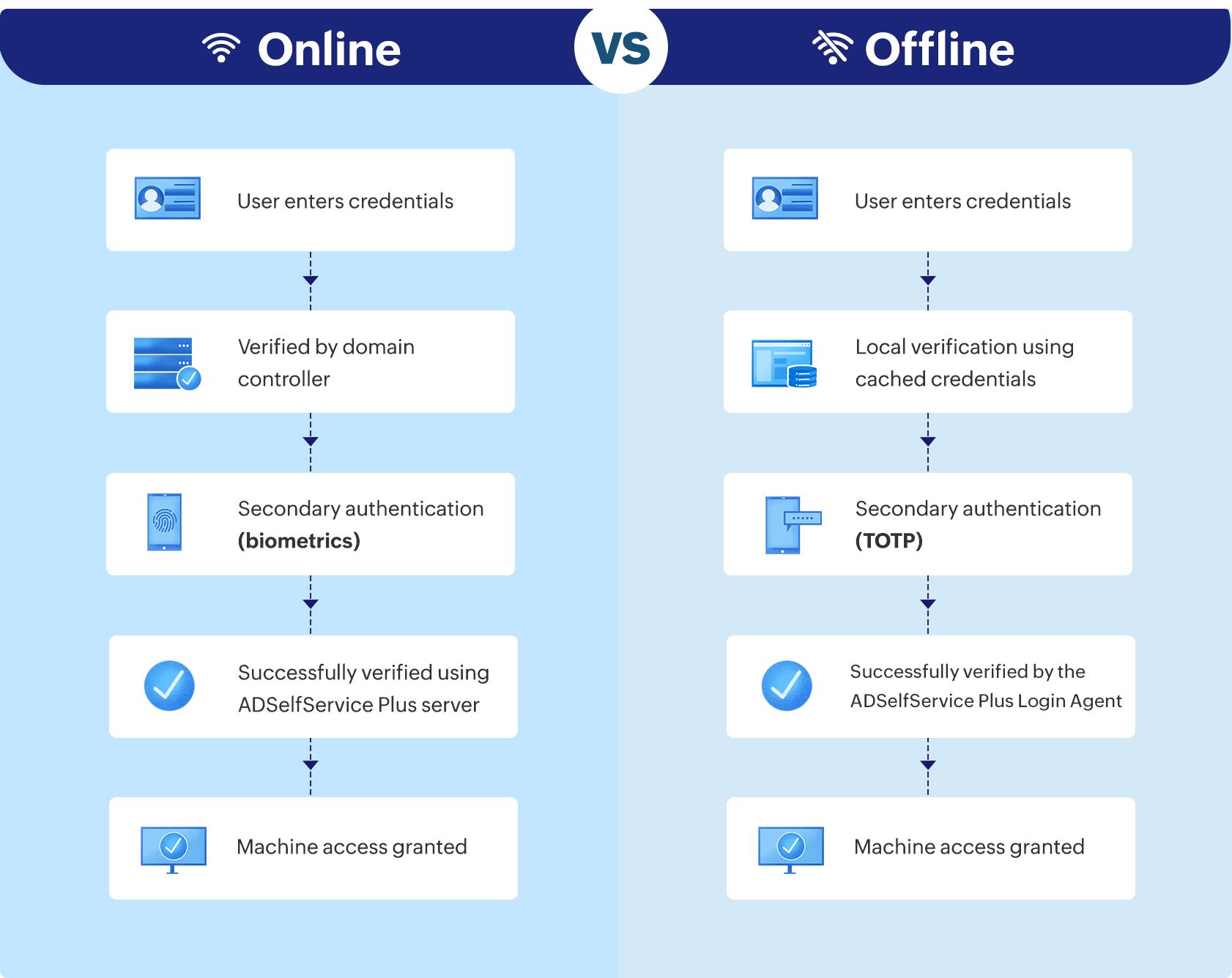 ManageEngine ADSelfService Plus支持Windows机器登录的离线MFA。管理员可以配置一个或多个MFA因素供用户进行身份验证。用户在线时需要注册各自的身份验证器,以便在离线时执行MFA。
