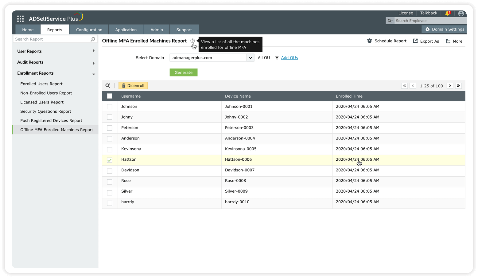 生成已注册离线MFA的用户的可读综合报表,以及时间戳,并在必要时取消注册用户。