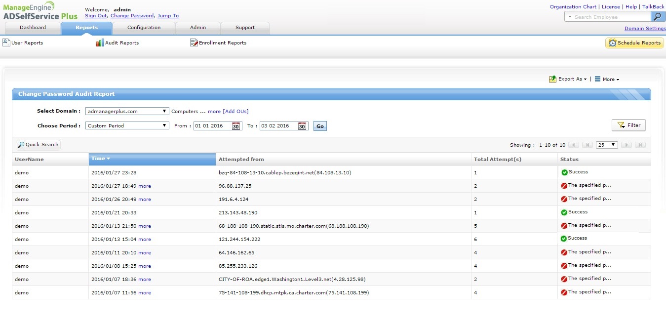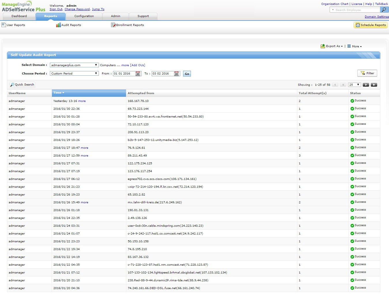 此报表提供了其使用ADSelfService Plus,在指定的时间段内在Active Directory中更新个人信息的用户的列表。您还可以查看有关自助更新的时间、所用机器的IP地址、尝试次数、自助更新操作的状态的信息。此外,可应用筛选器以仅查看成功的或失败的操作。