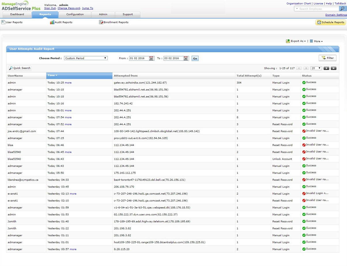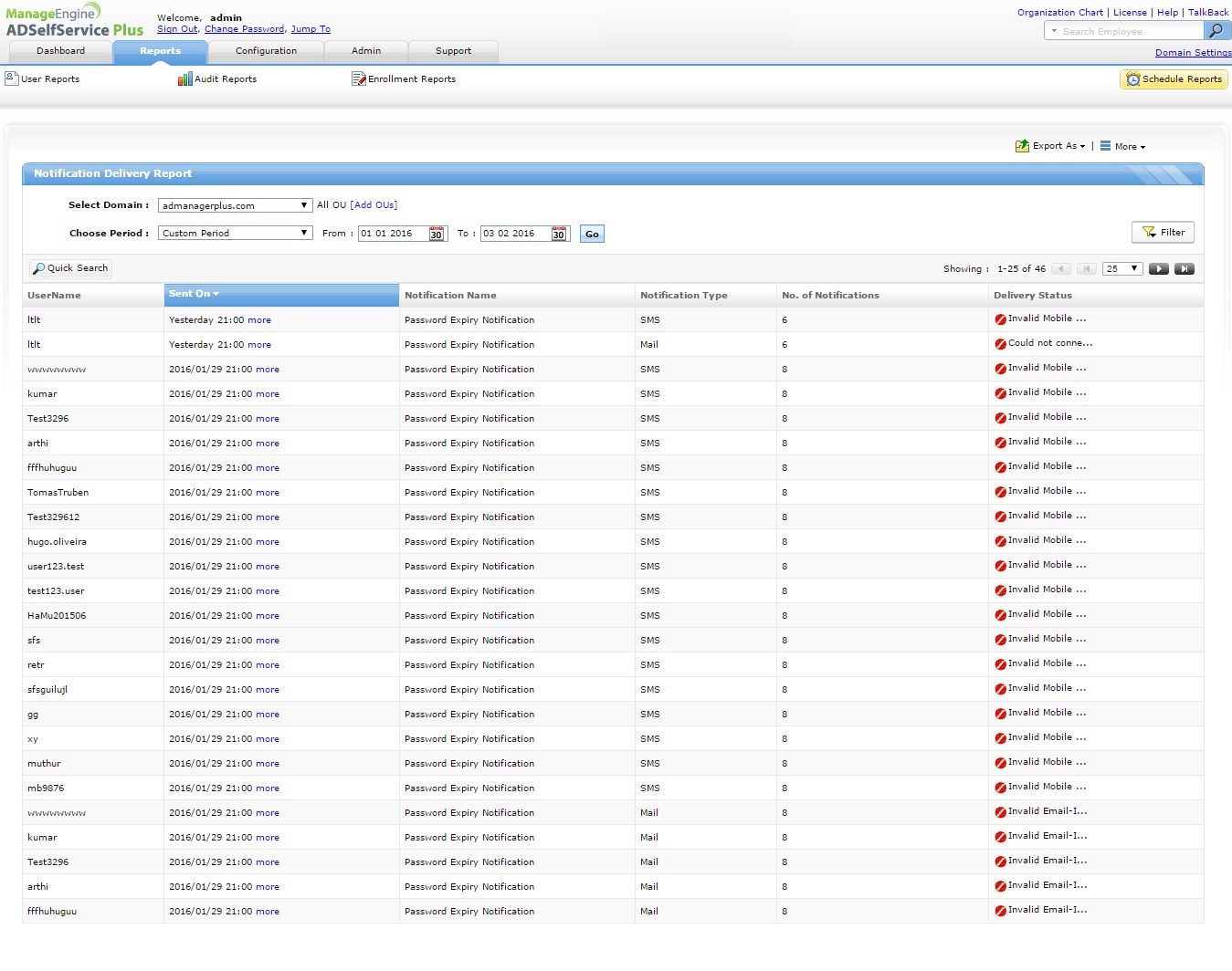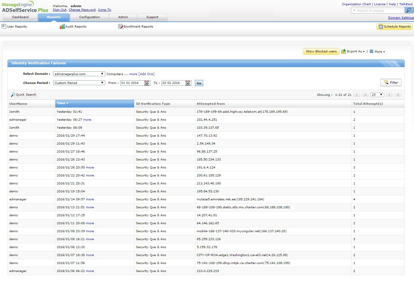ADSelfService Plus允许已注册的用户执行多项自助服务功能,而不用与管理员接洽。这一全套审计报表允许管理员跟踪用户在选定的时间段内执行的所有自助操作。