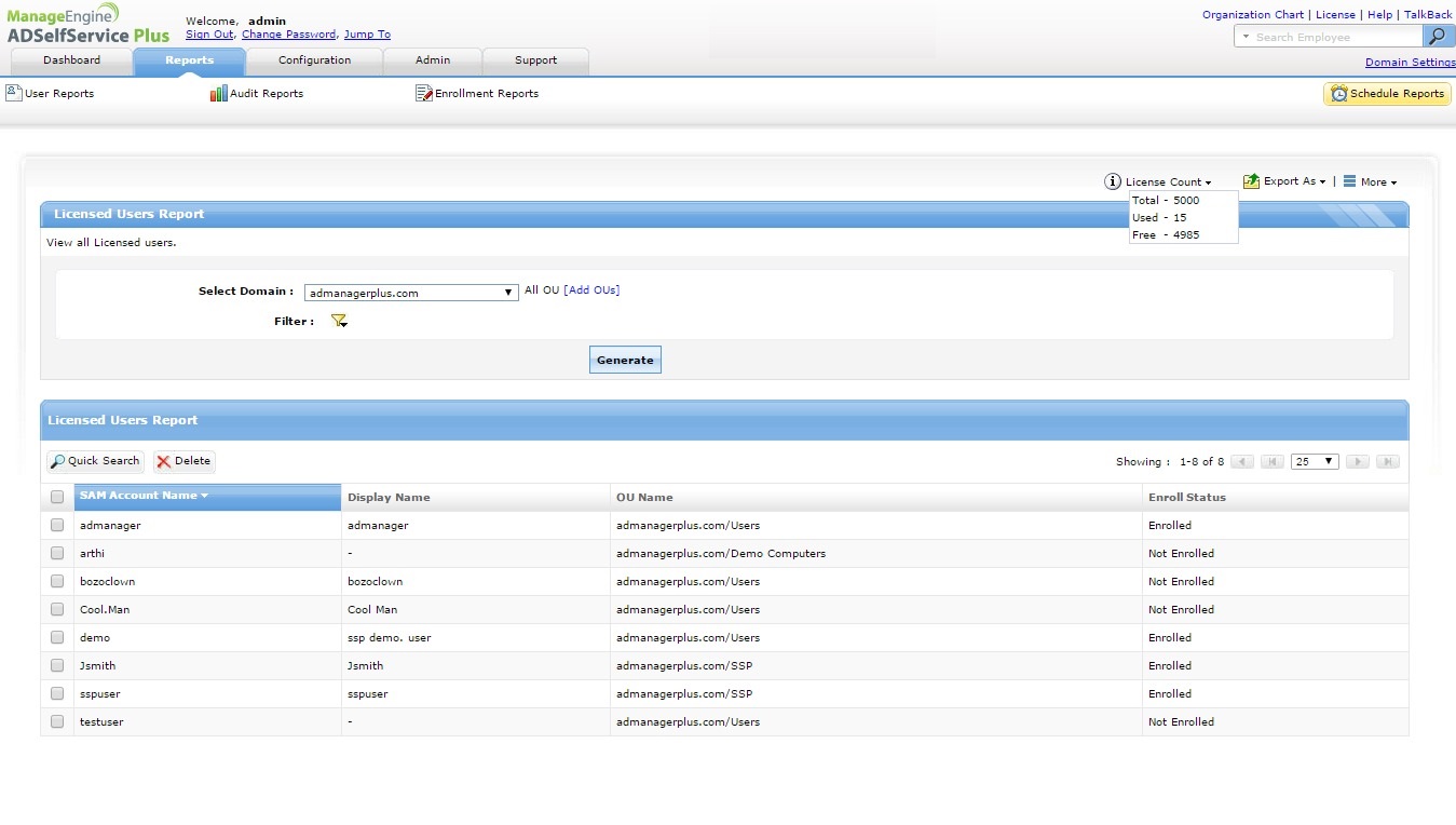 此报表列出当前使用ADSelfService Plus许可证的用户。此报表提供的信息帮助有效地管理许可证。