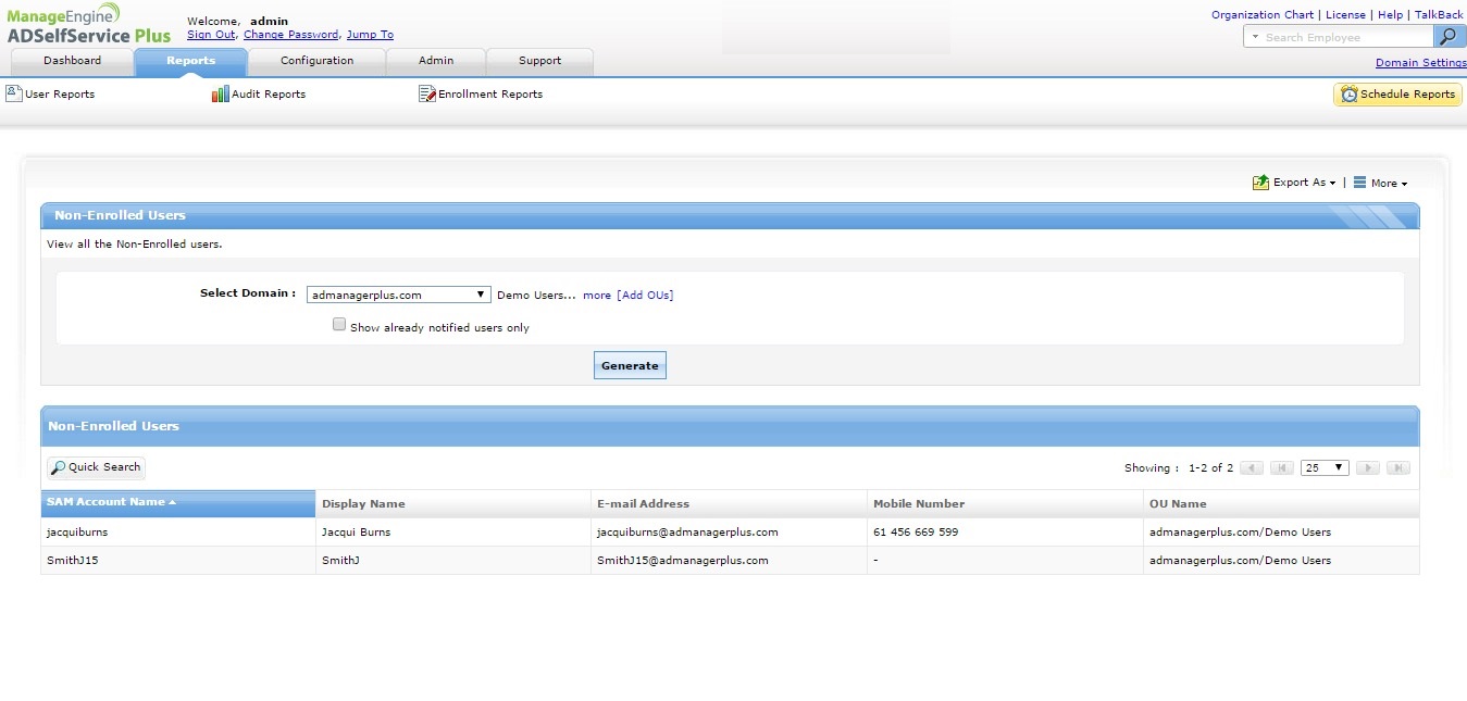 ADSelfService Plus提供几种现成的报表,为管理提供所有已连接域中用户密码状态的历史视图。您可以对特定OU或对整个域生成报表。仪表盘中提供了有关域用户密码状态的所有基本和最高级别信息。