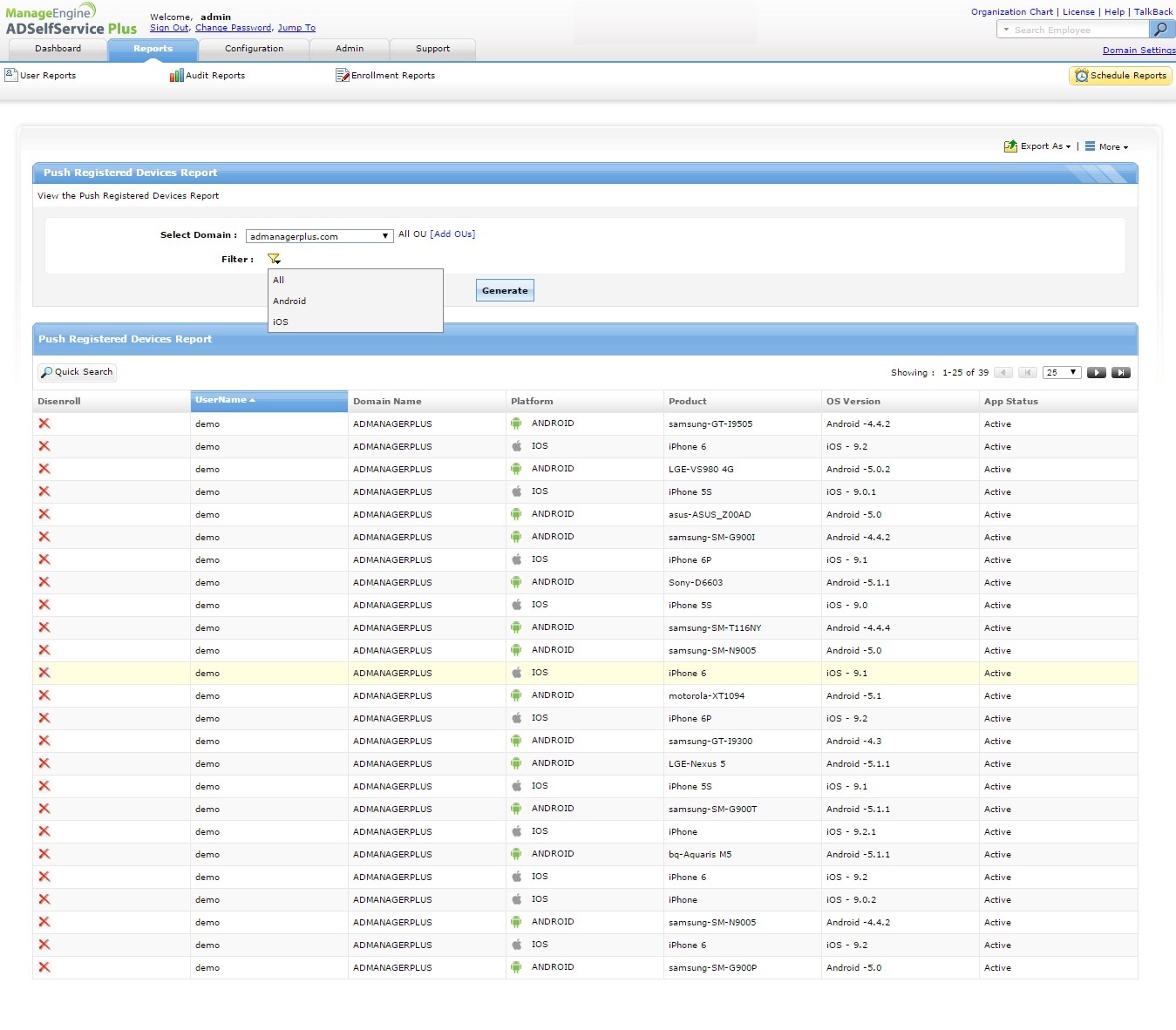 此报表显示已对推送通知注册的移动设备的报表。它允许管理员筛选并显示 Android设备或iPhone 。管理员还可以直接从报表中移除已注册的设备。