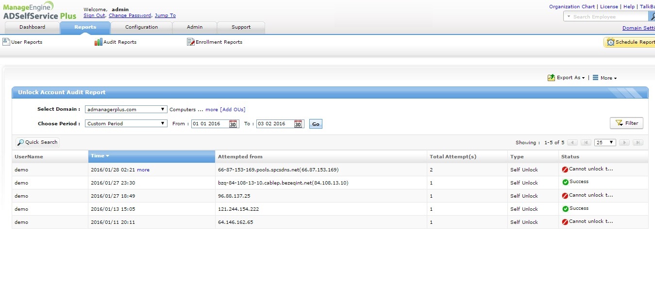 此报表提供其使用ADSelfService Plus解锁域帐户的用户的列表。您还可以查看有关帐户解锁的时间、用于解锁帐户的机器、所用机器的IP地址及更多项的信息,从而允许管理员分析您用户的帐户解锁操作。