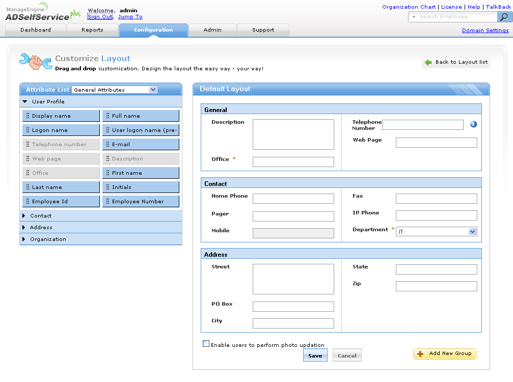 自助Active Directory更新提供可"拖放"定制web界面,此界面将更多控制权交给IT管理员/帮助台,允许他们标准化最终用户目录档案的格式。换言之,用户将按您期望的方式更新其Active Directory信息!