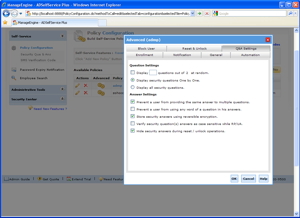 Policies Configuration deals with various policy settings that the administrator can configure with ADSelfService Plus for a end user. Policy Settings Configuration Include: