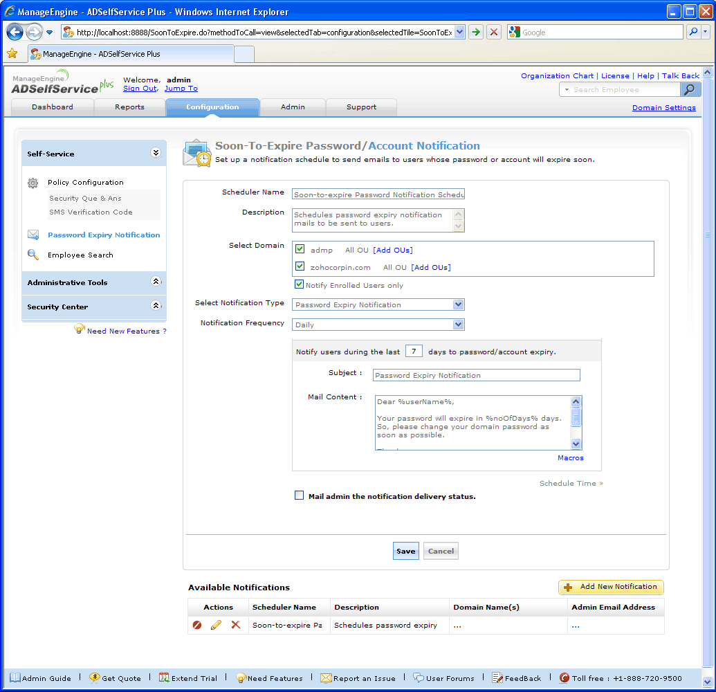 Intimate Active Directory users of their impending password/account expiry by mailing them these password/account expiry notifications.