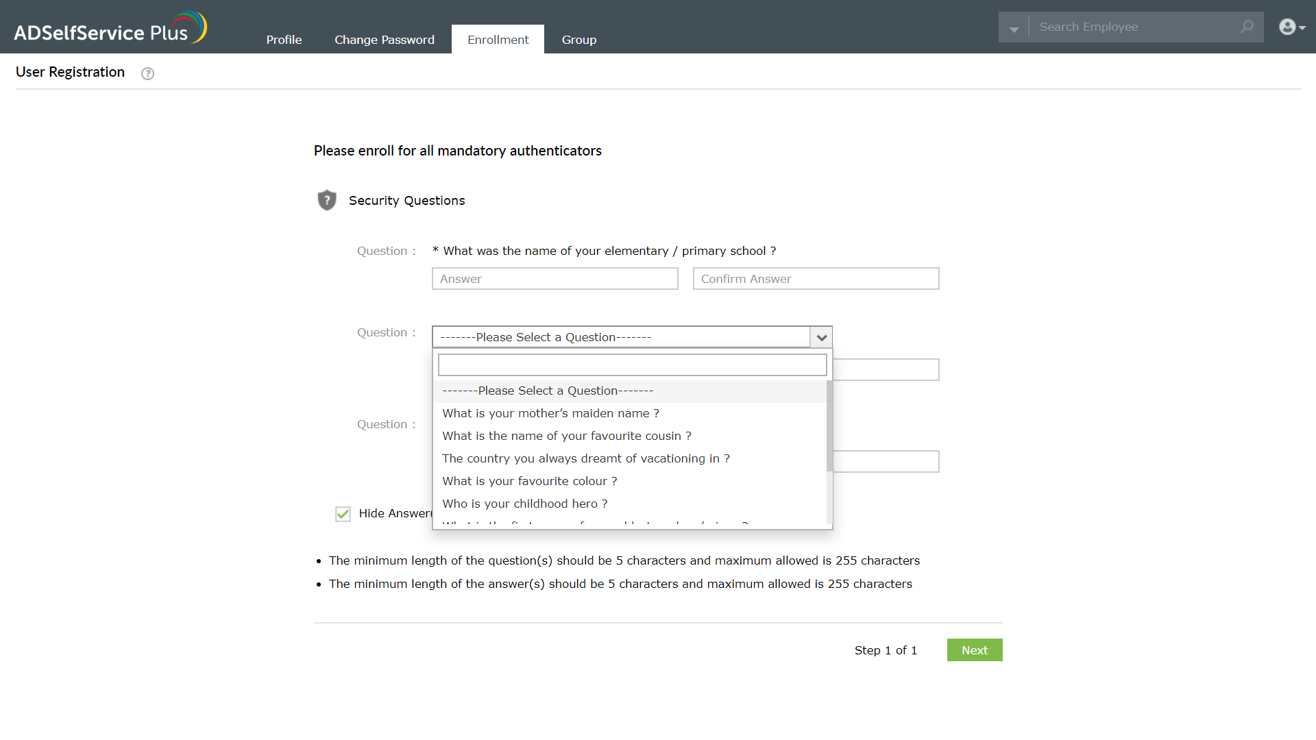 注意: 您的管理员可以选择强制执行ADSelfService Plus中提供的任何或所有身份验证技术。基于强制多因素身份验证技术,您需要提供某些信息。例如,假设您的管理员已强制将安全问题和答案作为验证您身份的方法。然后,您需要为显示的问题提供适当的答案。
