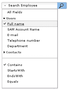 To perform criterion based search, click on the ‘downward pointed arrow’ in the ‘Employee Search’ box & select the desired option