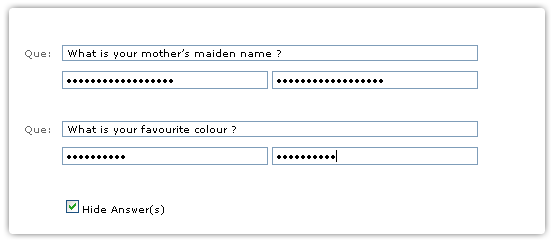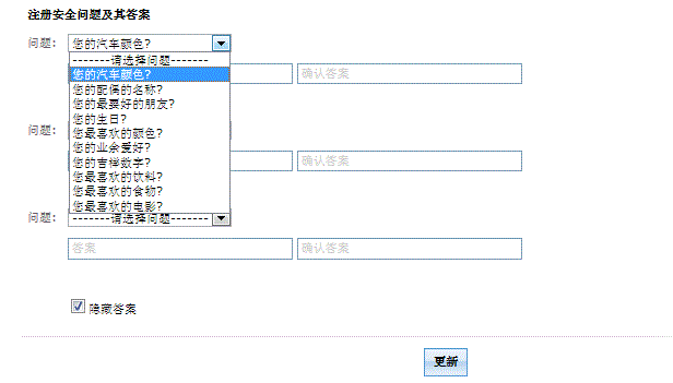 使用安全保密问题及其答案进行登记注册: 设置保密问题及其答案,问题可以从系统已有的问题中加以选择,也可以设置自己的问题(取决于管理员的设置)