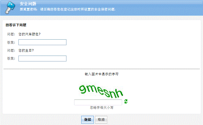 如果只采用安全保密问题的方法,则会提示您输入您所设置的安全保密问题的答案。输入后点击继续按钮。