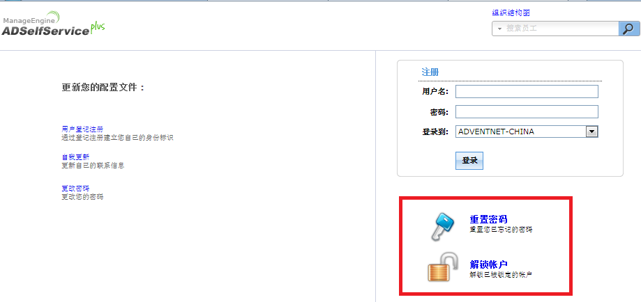 而对于普通用户访问ADSelfService Plus时,将会看到下图的登录页面,点击其中的"重置密码",即可进行密码重置。