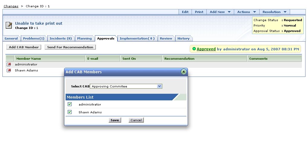 该工具可以将审批邮件发送给CAB成员,并且可以在不登录该工具的情况下获得他们的建议。根据变更顾问委员会的建议,变更管理者可以批准或拒绝变更。