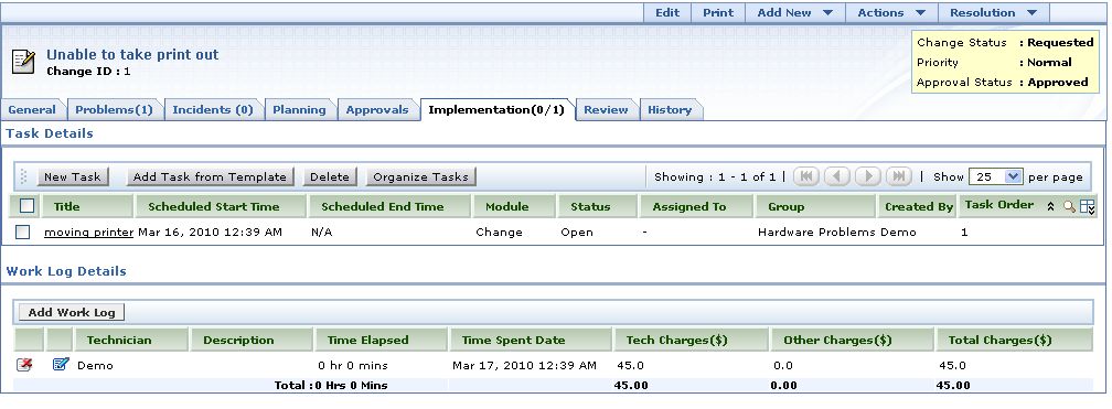 变更流程可分为多个任务,并由参与变更流程的其他技术人员共享。任务可以单独安排和分类。您还可以要求客户针对每位技术人员所花费的时间添加工作日志。