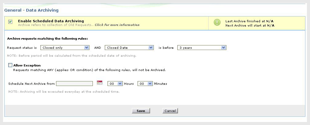 数据归档通过将未使用数据的备份并把其移至单独的存储状态(存档状态),从而解决此问题。归档请求单独处理,包括单独的搜索操作和报表。这极大地提高了ServiceDesk Plus MSP的性能和效率。