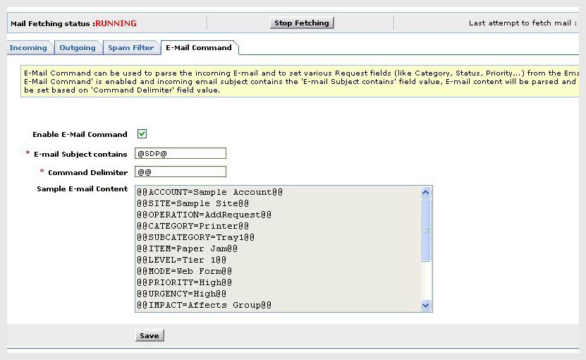 借助管理员设置的命令定界符,邮件内容解析可以将入站电子邮件转为工单。 邮件内容解析可以预先设置好定界字段,包括类别、优先级、组、级别等字段。 因此,无论技术人员身在何处(远距离或客户端),电子邮件都自动被解析并根据指定的命令执行操作。
