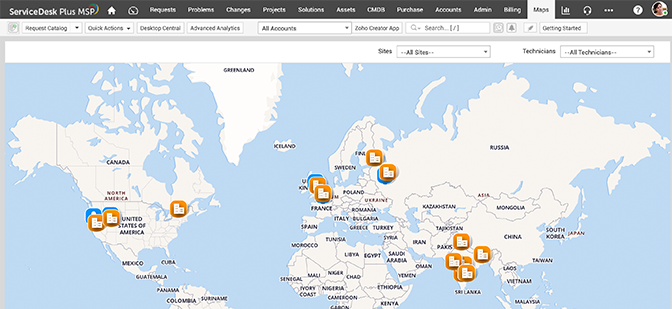 With the Google Maps and Zoho Maps integration, ServiceDesk Plus MSP makes it easy for IT administrators to visually locate all their on-site technicians and client-sites in a single place. This enables you to plan and coordinate the scheduling of field staff in order to minimize technician availability issues and ensure maximum efficiency on the field.
