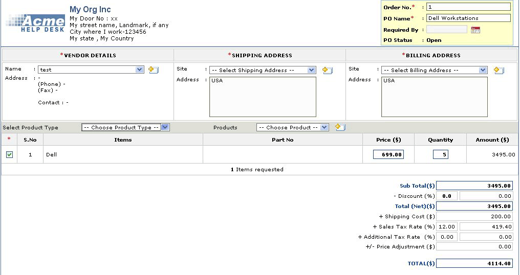 • 自动填充PO字段,如组织名称、账单地址、送货地址、税率等。