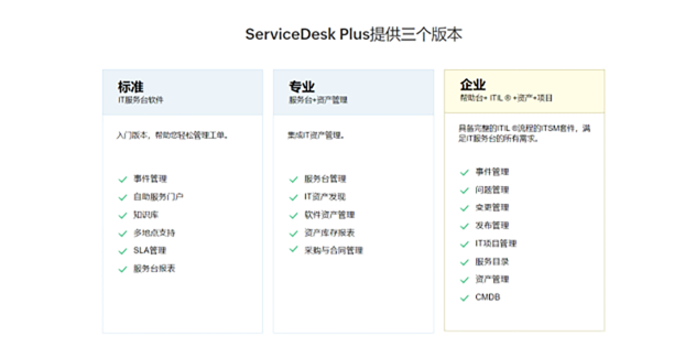 为适应不同规模、类型的企业或机构对于服务的需求,ManageEngine也适时的提供了相应的ITSS产品解决方案,ManageEngine的旗舰ITSS运维工具——ServiceDesk Plus,权威可靠,提供云版本、本地部署版本,还有移动版本App。上线速度快、门槛低,三种版本产品适应不同企业的不同需求。