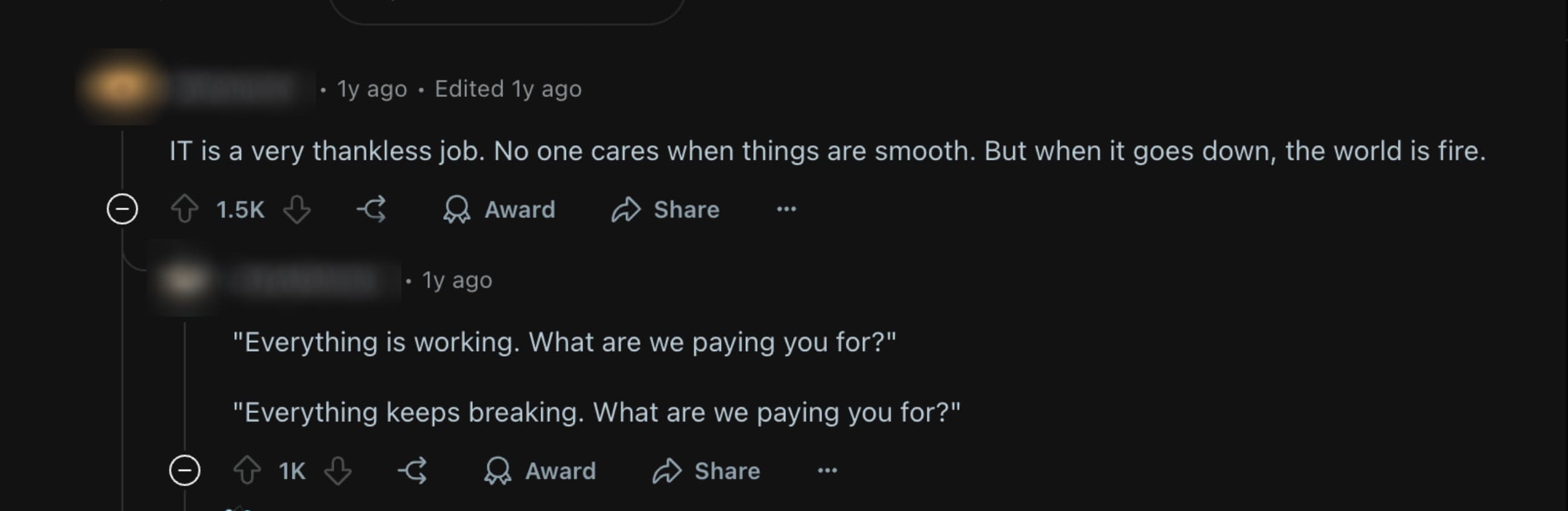 有一个Reddit帖子很好地展现了全球各地工作过载的服务台所面临的现实场景。事实上,2024年的一项调查显示,61%的IT专业人士认为,从事IT工作在一定程度上对他们的身心健康造成了负面影响。随着精简的IT团队要支撑不断扩张的企业,服务台的工作量呈指数级增长,但人员规模却未能同步扩大。再加上人才短缺、经济环境波动以及用户对系统可用性要求的不断提升,IT服务台比以往任何时候都更迫切地需要交付成果。