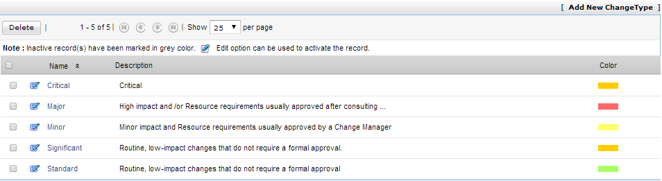 ServiceDesk Plus提供根据ITIL标准定义的预定义变更类型。您也可以自定义这些变更类型,或者根据需要添加新的变更类型。