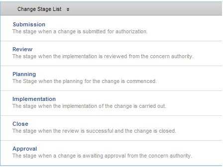 您可以在 ServiceDesk Plus中设置每个阶段,并获得变更过程的完整时间线,可以在6个阶段中的每个阶段执行操作。