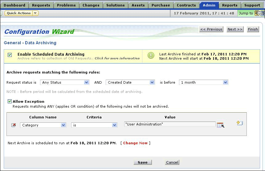 Data Archiving is a process of moving old unused requests from the active database into a separate storage state on a routine basis. It is most useful since the application accumulates large volume of closed/resolved requests that may be required for further reference, which, in the long run, hinders the performance of your system.