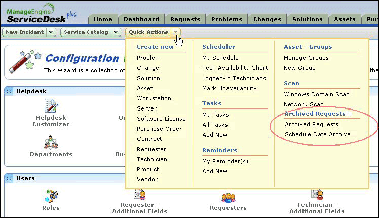 You can also view the archived requests by clicking on Quick Actions at the top left side and selecting Archived Requests from the drop down menu. [