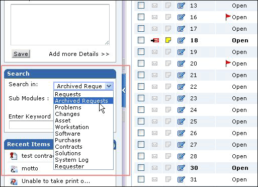 You can conduct a search for the archived requests by using the Search option in the Request module. Select Archived Requests and enter the keyword to search for a particular request. [