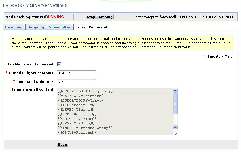 E-Mail Command is used to parse the incoming e-mail and set various request field values like Category, Status, Priority, Level etc, from the e-mail content.