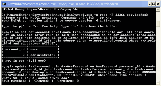 Open command prompt on the application server,connect to the folder ManageEngine\ServiceDesk\mysql\bin> and use the command mysql.exe -u root -P 33366 servicedesk
