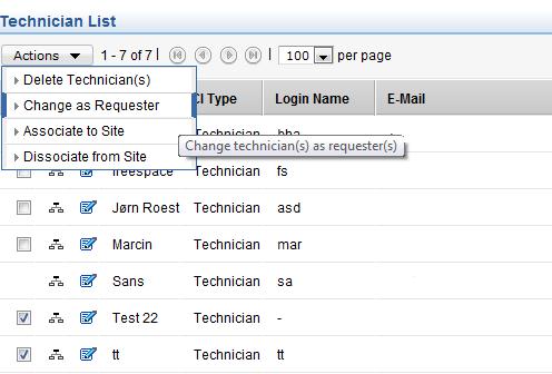 Go to Admin -> Technicians. From the list view, choose the technicians to change as Requesters. Click Actions tab and select Change as Requester. [