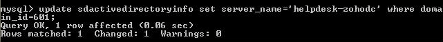 mysql> update sdactivedirectoryinfo set server_name='helpdesk-test1' where domain_id=601; [