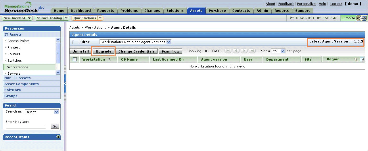 IT Assets: All Assets with the product type as IT asset are considered as Nodes. Assets which are discovered during the scan process of ServiceDesk Plus are listed under IT Assets (or nodes). For example, Workstations, Servers, Routers, Switches and Access points.