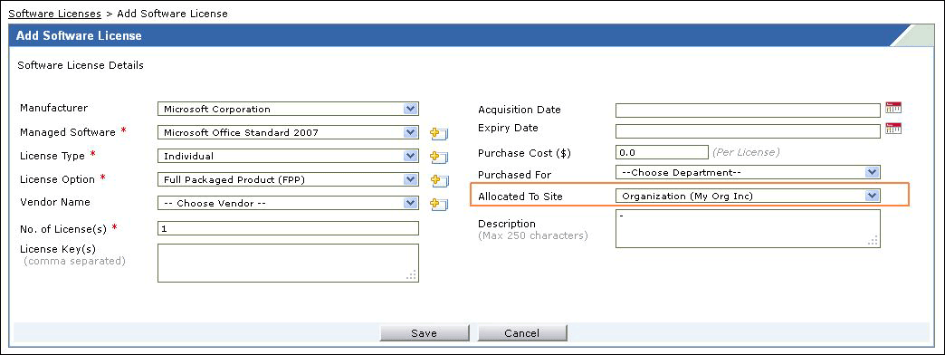 Organization License are software licenses which can be applied to workstations across the sites. While adding the software license, select Organization option from Allocated to Site drop down box. [