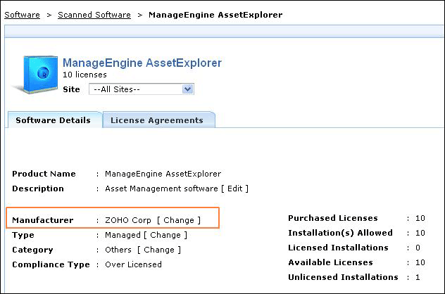 Yes you can change the manufacturer name of the software. From the Scanned Software List View page, click the software to change the manufacturer name. In the details page, click the [Change] link beside the Manufacturer Name. [