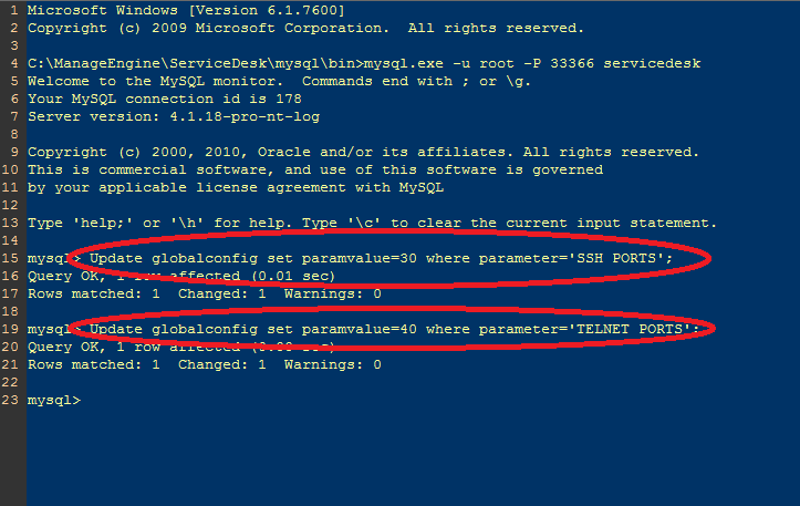 ServiceDesk Plus uses 22 and 23 as the default port number for SSH and Telnet respectively. If these ports are changed and used in the organization widely, then ServiceDesk Plus can be updated to use the new port number for SSH and Telnet. To update the application with the new port numbers use the query given below, the same can be used for both MYSQL and MSSQL database.