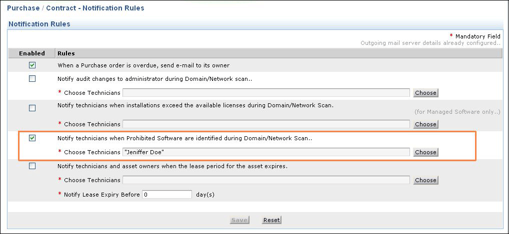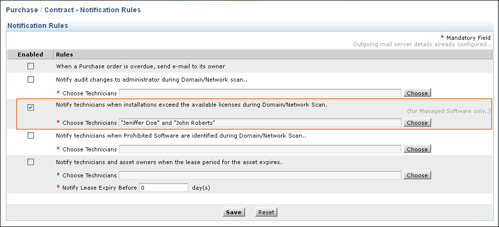 While adding a license agreement, you can select users to notify when a license agreement is about to expire. Also, you can select the days before which the notification should be sent to the selected users.