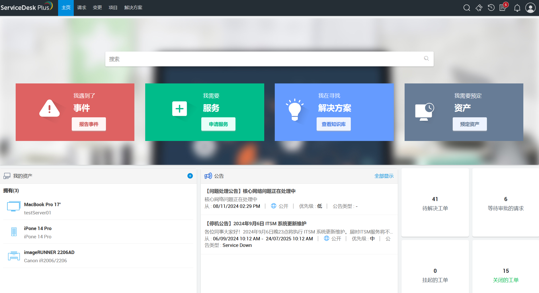 通过ServiceDesk Plus中的自助服务门户,您的用户可能够自己提交工单。这可以节约您和帮助台多少时间来解决当前的问题或以前未解决的问题。用户可以创建、查看和监控工单直到问题解决。此外,技术团队还可以通过服务门户的公告功能让用户及时了解各种情况下的停机情况。