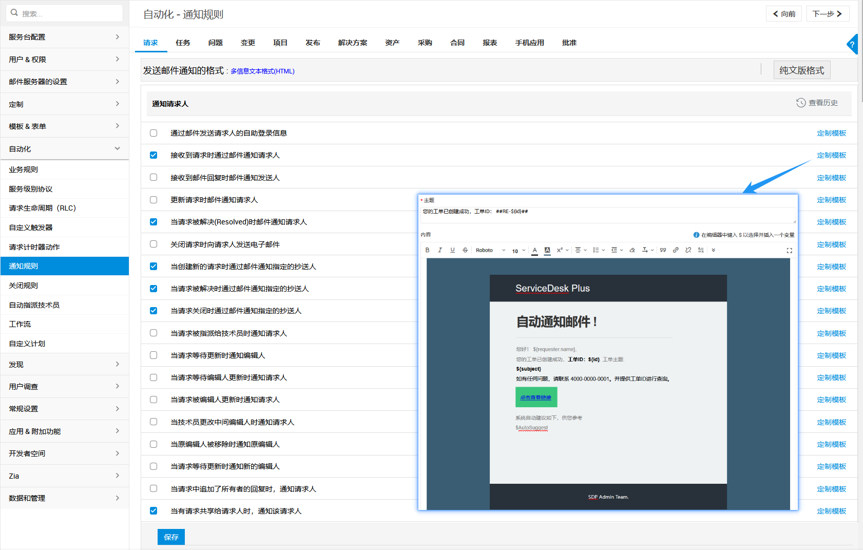 通知规则让您在用户提出请求时向他们发送确认信息。这让用户立即知道他们的请求正在被处理。您还可以设置为,在将工单分配给技术人员或在工单内进行更改时发送通知。
