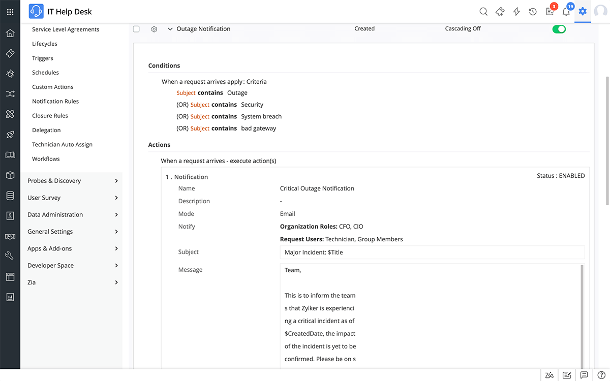 通知规则可以确保用户了解工单处理的进度。通知规则设置后,用户在提出支持请求时会自动发送确认信息。也可以设置为,当将工单分配给个人、团队或违反SLA时发送通知。