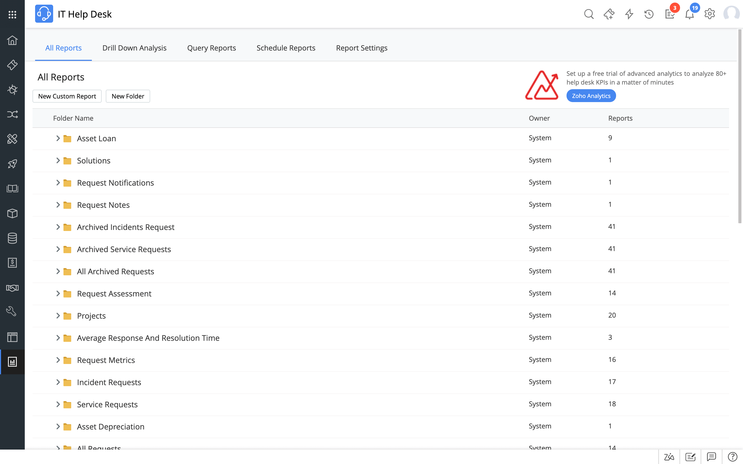 报表是工单软件系统的最重要的功能之一。使用报表可以检查服务台的工单量、工单处理状态以及违反SLA的情况。您还可以使用趋势分析报表查看服务故障和其他宕机情况。