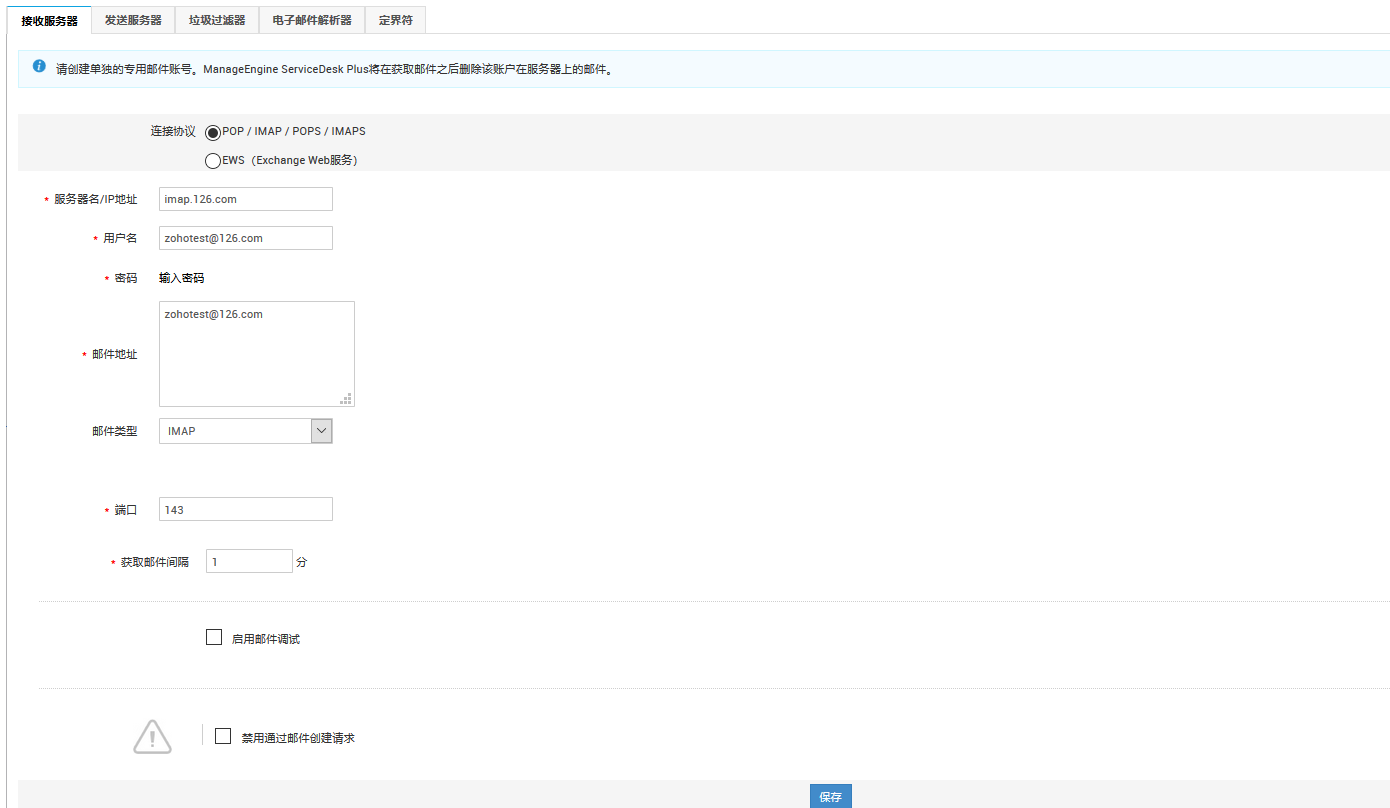 | 邮件类型 | 选择电子邮件提取的类型。 如果选择IMAP,则启用TLS。 |